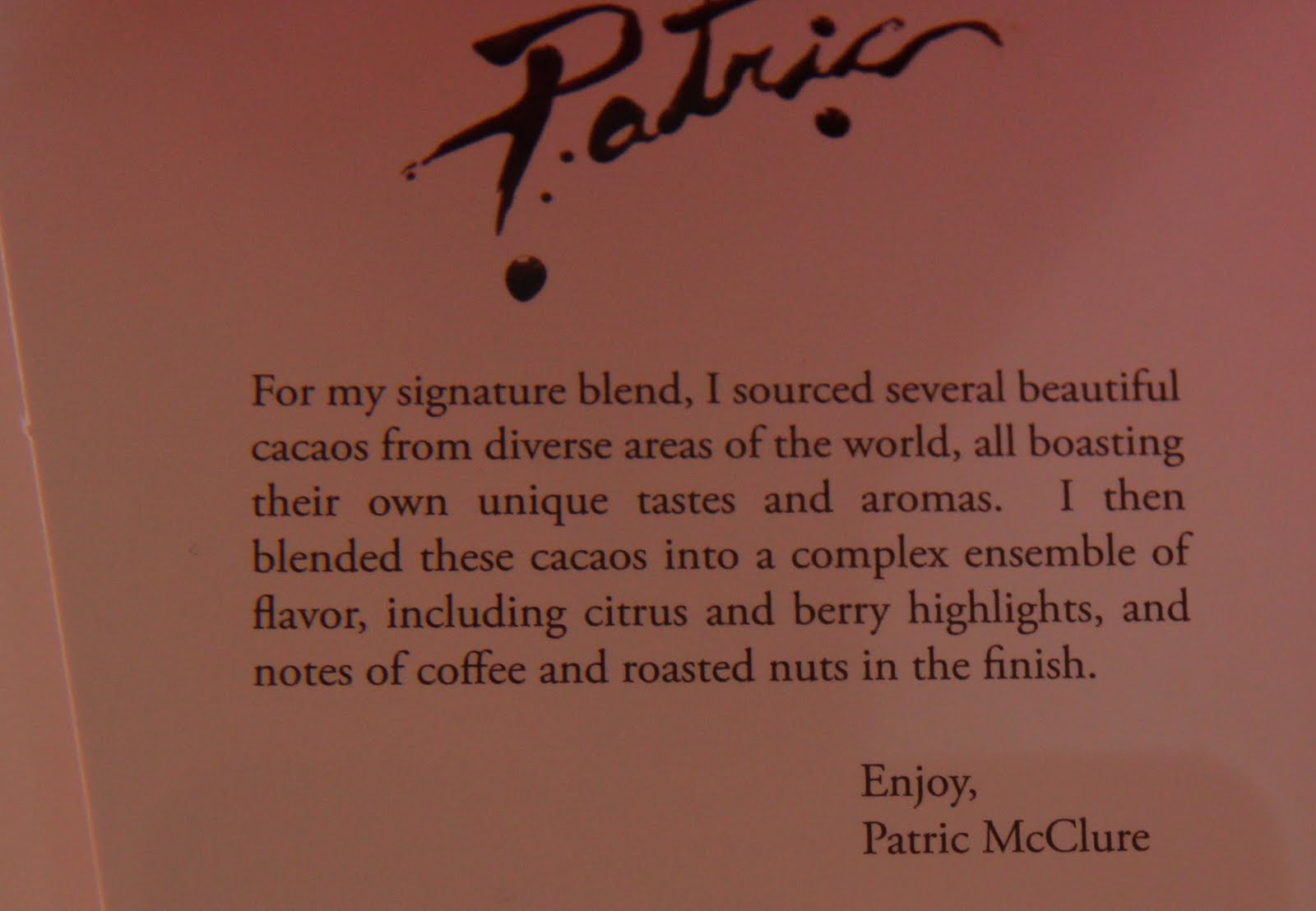 Once back in the States in 2004, Alan began his self-taught journey on chocolate. After a couple of years of learning about cocoa beans, roasting techniques, the chocolate making process and countless hours preparing batches, Alan McClure started Patric Chocolates in 2006 and had his first bar packaged and ready for shelves July 23rd, 2007.
