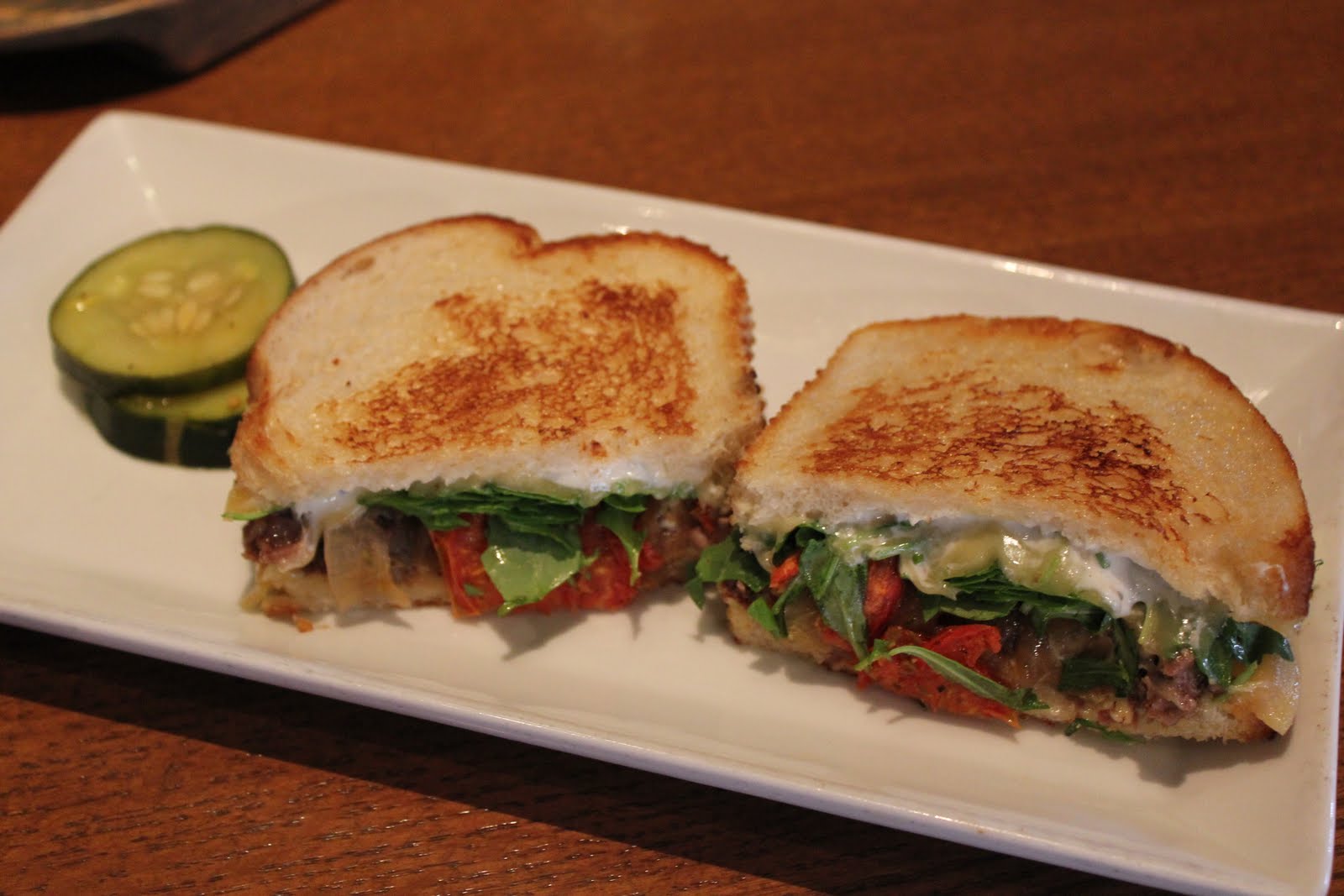 The sandwich I chose was the short rib sandwich. It had smoked Gouda, caramelized onion, oven-dried tomato, arugula and horseradish aioli all grilled up on sourdough bread. This sandwich is unbelievable. The flavors are so good and I love the texture of grilled sourdough bread. The salad I chose was the baby arugula salad it had beets, walnuts, shaved fennel, sun-dried cranberries and was topped with a goat cheese croquette. I am a sucker for a salad like that. I love the combination of the salty goat cheese and the sweet cranberries together. Shannon opted for the grilled four cheese sandwich and the butter lettuce salad. We also shared an order of the truffle fries. Everything was exceptional!