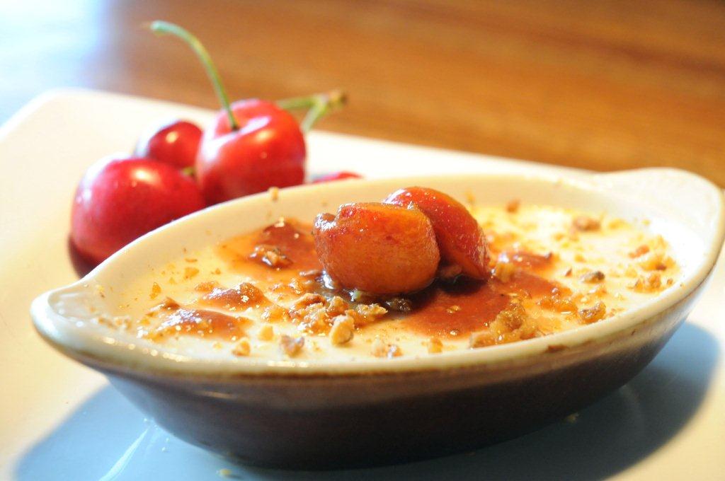 Rainier Cherry Panna Cotta w/ Macerated Cherry Gastrique and Candied Walnuts