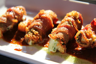 The Poppers, filled with jack cheese and cilantro and served with a chipotle barbecue sauce are tasty! The bacon is crispy, the cheese melted and gooey and the sauce gives them a nice kick.