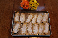 Once the bread is out, take garlic clove and rub it over each deli roll half then let cool.