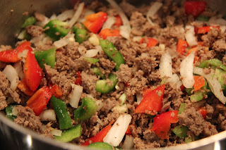 In large stockpot on medium high heat, cook ground beef until no longer pink. Drain and return to pot. Add in peppers, onions and garlic and cook until tender. Add in remaining ingredients. Mix well to combine. Reduce heat and let simmer 15 to 20 minutes.