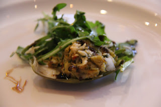 Artichoke-Stuffed Artichoke Leaves, with organic arugula, Parmesan cheese and balsamic glaze. Very Tasty!