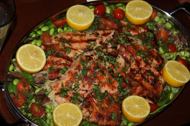 The main courses included a Columbia River Steelhead Trout, with spring vegetables, basmati rice and lemongrass sauce, Lamb T-bone Chops, with asparagus, truffle mashed potatoes and red wine glaze and Spicy Snow Peas & Shiitake Mushrooms, with roasted almonds.