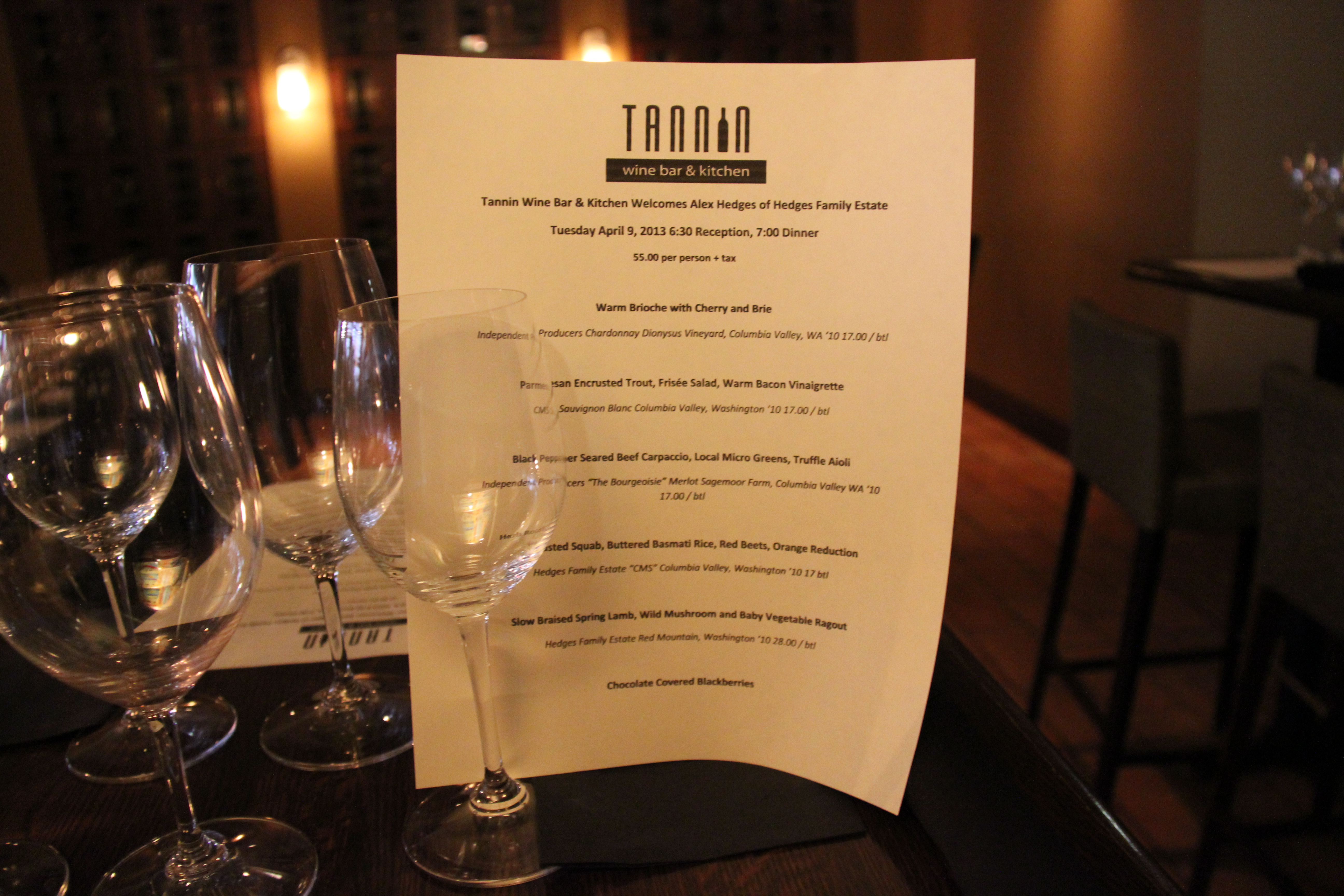 I have recapped the menu below. Warning it will leave you wanting good wine and good food and Tannin Wine Bar and Kitchen where you can enjoy Hedges Family Estates wine and great food will curb that craving!