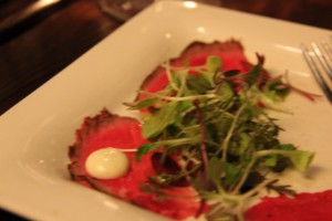 Black Pepper Seared Beef Carpaccio, Local Micro Greens, Truffle Aioli with Independent Producers “The Bourgeoisie” Merlot Sagemoor Farm, ColumbiaValley