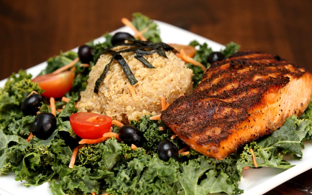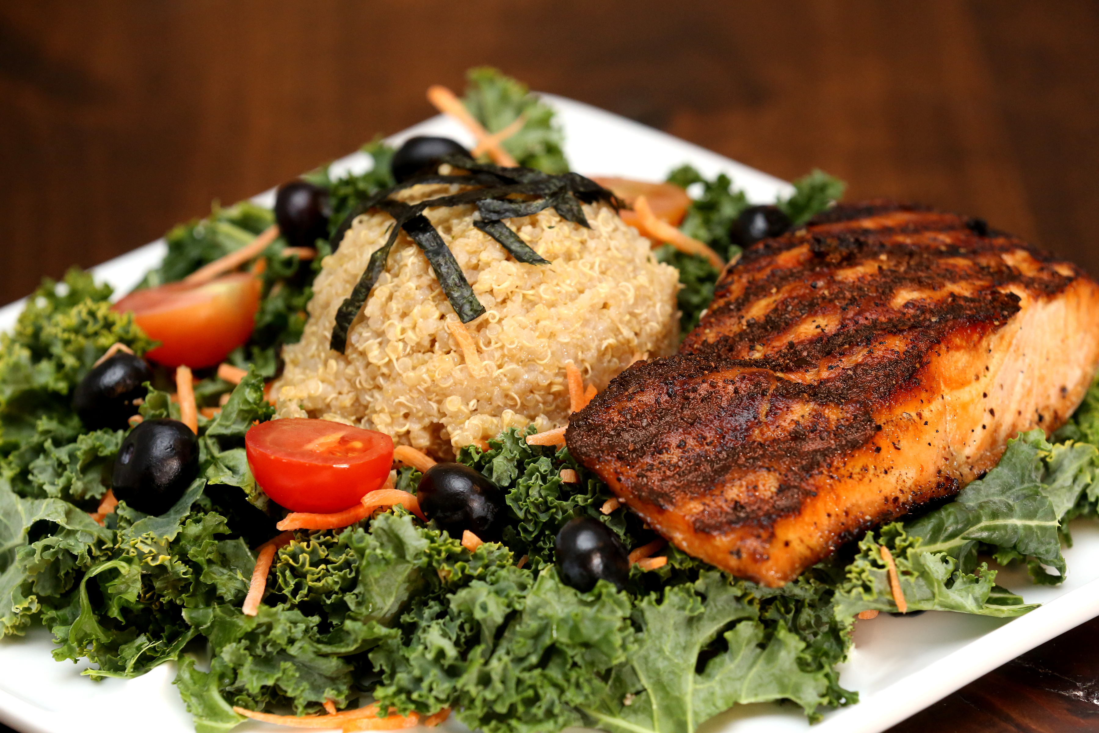 · Superfood Kale Salad with Grilled Salmon with tender kale, carrots and cherry tomatoes tossed in homemade sesame soy ginger vinaigrette, topped with soy ginger quinoa, blueberries, dried nori and grilled salmon (Blue Moose Bar & Grill and Barley’s Brewhaus Kansas City metro locations)