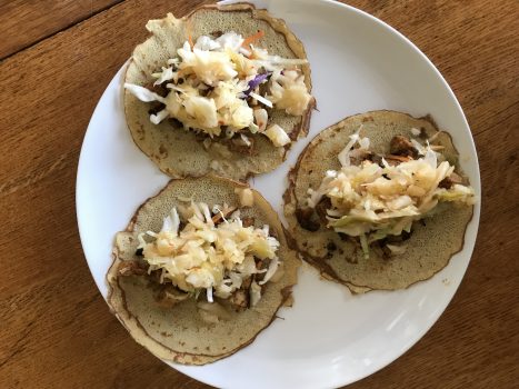 So to create my Lazy Street Tacos, I heated up some of the chicken from the kit, and topped those crepes with a scoop of chicken and the gnar gnar kraut featuring peppers and jalepeños which gave them a great kick. The Costco kit also comes with a cilantro lime creme which is yummy to drizzle on top.