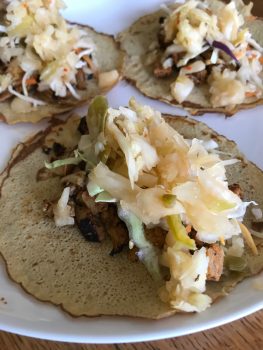 For some reason, I am obsessed with street tacos, and usually order them when we go out to a restaurant that has them. I also have found the chicken street taco kit from Costco. I’m thinking what I really like about them is the slaw that is always on top and the Cleveland Kraut flavors reminded me of slaw toppings you see on tacos so I took a stab at creating my own